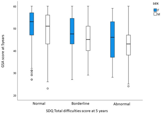 The GSA score for the different SDQ categories according to the gender of the child is presented in Figure 2.