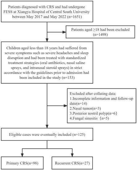 Children less than 18 years (n = 125) were recruited for the study. These children had suffered from severe symptoms such as severe headache and sleep disruption and had been treated with standardized treatment strategies (oral antibiotics, nasal saline sprays, and intranasal steroid sprays) in strict accordance with the guidelines before admission, but the therapeutic effect was notably insufficient. Recurrence was identified as the re-emergence of clinical symptoms, and endoscopic and CT evidence for at least 2 months despite a rescue regimen of antibiotics and oral steroids after FESS [10,15]. The diagnosis of AR is based on clinical history, skin tests, or the presence of serum-specific immunoglobulin E (IgE) antibodies to allergens [16]. The diagnosis of asthma relies on the recognition of a characteristic pattern of symptoms, the occurrence of asthma attacks, and sometimes by basic lung function tests [17]. All children with CRS underwent detailed routine otolaryngology, physical and laboratory tests (Figure 1).