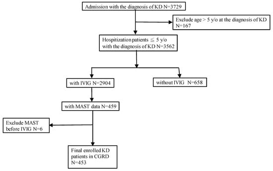 The study design of enrollment for the process of inclusion and exclusion of subjects. CGRD, Chang Gung Research Database; IVIG, intravenous immunoglobulin; KD, Kawasaki disease; MAST, multiple allergen simultaneous tests system; N, number; y/o, years old.