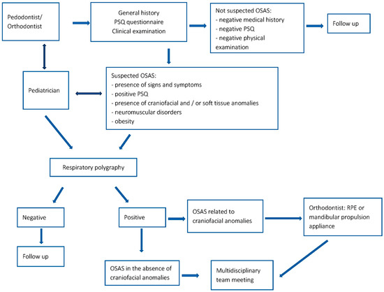 Orthodontists and pedodontists play a crucial role in identifying children with OSAS and implementing appropriate treatment interventions to improve or resolve their condition. The diagnostic role of orthodontists and pedodontists is depicted at the beginning of the flowchart in Figure 2. The diagnostic process involves the administration of validated questionnaires (such as the PSQ) to parents, gathering general history information, and conducting a clinical examination. These steps help identify potential risk factors associated with obstructive sleep apnea syndrome (OSAS), including positive responses on the PSQ questionnaire, allergies, congenital syndromes, hyperactivity, lack of concentration, snoring, sleep apnea, and diuresis. An extraoral examination can reveal adenoid facies, which is typical in individuals with OSAS. Additionally, an intraoral examination conducted by the orthodontist and pedodontist is crucial for identifying specific indicators such as a contracted palate with an ogival and deep shape, posterior crossbite, anterior crossbite, tonsillar hypertrophy, dental and/or skeletal malocclusion, and dental crowding. The diagnostic pathway concludes with the confirmation of diagnosis through respiratory polygraphy. By following this flowchart, 28.3% of subjects in a group of 134 patients identified as diagnostic suspects were ultimately diagnosed with OSAS. By employing this systematic approach, orthodontists and pedodontists play a vital role in the early identification and diagnosis of OSAS. Through the integration of questionnaires, clinical examinations, and respiratory polygraphy, they contribute to the accurate diagnosis and subsequent management of the condition. By promptly recognizing the signs and symptoms of OSAS, the risk of complications arising from untreated or mismanaged cases can be minimized.