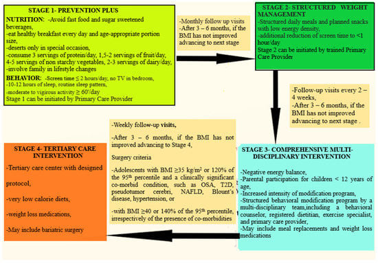 The most effective behavioral approaches are goal setting, positive reinforcement, self-monitoring, contingency training, stimulus control, cognitive restructuring, behavior chains, problems solving and relapse prevention. Treatments such as appetite-awareness training and the regulation of cues are considered experimental. According to the US Preventive Services Task Force, a multicomponent intervention program is usually most effective (with a reduction in the BMI z score ≥ 0.20) when it occurs in person, engages the entire family and delivers at least 26 h per year of nutrition, physical activity and behavior-change sessions over 3 to 12 months [25]. However, it is difficult to implement such interventions since they are costly and require a multidisciplinary team with specific training.