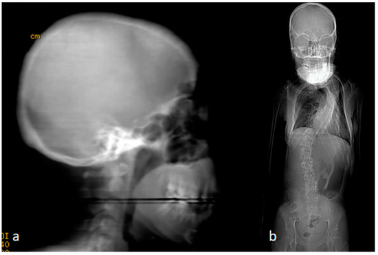 Clinical documentation and radiological documentation are shown in Figure 1a,b. The clinical photo showed craniofacial dysmorphic features, marfanoid habitus, long and thin limbs, arachnodactyly, intellectual disability, and scoliosis of 65° of Cobbs angle, and a Milwaukee brace was prescribed to prevent further spine tilting (Figure 1a). The lateral skull radiograph showed scaphocephaly (the skull is of abnormal contour, showing a bilateral narrow head because of premature closure of the sagittal suture). The synostosed sagittal suture formed a well-palpated osseous ridge (Figure 1b).
