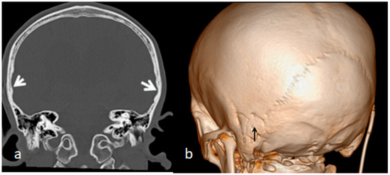 Figure 4. (a,b). Scout CT scan of the skull showed a clear scaphocephaly which signifies early fusion of the sagittal suture (Figure 4a). The 3D reconstruction CT scan of the skull shows quite clear apparent premature neurocranial suture closure easily observed along the squamosal sutures (arrows) associated with partial closure of the coronal sutures (there are apparent bony ridges of bilateral squamosal sutures consistent with premature craniosynostosis). The bony ridges along the squamosal suture arching posteriorly from the pterion and connecting the temporal squama with the inferior border of the parietal bone have been all prematurely fused (arrows) (Figure 4b).