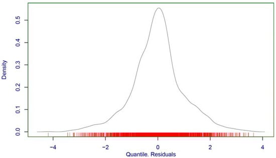 Concerning residual analyses (Figure 2), the model had a mean of −0.00022, variance of 0.9983, moment-based skewness of 0.0247, kurtosis of 4.0926, and Fiberfill correlation coefficient of 0.9915. This indicates inadequacies in the model’s shape parameters. This is, however, understandable given that DPO has only two parameters, making it impossible to model the shape of the data. Given that this limitation cannot be overcome with existing explicit GAMLSS distributions, the DPO model is adopted.