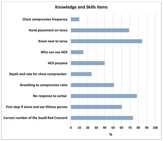 The knowledge and experience of different skill elements when performing CPR were assessed among the participants. These items include chest compression frequency, hand placement on the torso, kneeling next to the torso, who can use an AED, the purpose of an AED, depth and rate for chest compression, breathing to compression ratio, no response to verbal stimuli, first step if you are alone and see a lifeless person, and the correct number of the Saudi Red Crescent. CPR, cardiopulmonary resuscitation; AED, automated external defibrillator.