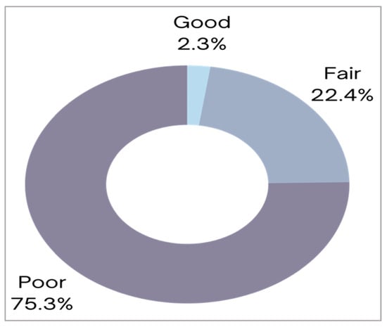 Furthermore, the highest level of knowledge, i.e., good level category, was obtained by the participants who received CPR training as compared to the other groups, as shown in Table 3. Indeed, these participants with a good knowledge level (total n = 15) were found to have mostly (n = 11/15) previous CPR training. Conversely, the contributors with a poor knowledge level (total n = 488) showed predominately (n = 411/488) absence of CPR training, thus resulting in a statistically significant difference (p < 0.001) between the examined groups. Among the other sociodemographic parameters, our analysis disclosed no statistically significant differences observed between knowledge levels and time since previous CPR training (p > 0.05). Moreover, when we assessed the differences in knowledge level between parents and teachers, we also found no statistically significant differences (p > 0.05). Similarly, there were no statistically significant differences in knowledge levels between genders, age groups, nationalities, educational levels, and job fields (Table 3). Collectively, as graphed in Figure 2 and Table 3, our analysis showed that only a small percentage, around 2.3% (i.e., 15 participants), unveiled a “good” knowledge level, whereas the majority (75.3%, i.e., 488 participants) had a poor knowledge level of CPR performance and skills. These findings are affected significantly by whether a participant had acquired former CPR training or not.