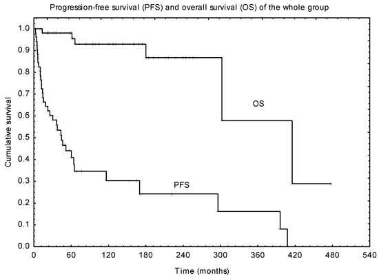 The main study endpoints were treatment-related toxicity, patients’ overall survival (OS), and progression free survival (PFS). At each step of the treatment, the rate of complications was obtained, and every worsening of the symptoms was scored. OS was calculated from the date of tumor diagnosis to the date of death of the patient or the last follow-up visit. PFS was evaluated from the date of the last day of primary treatment (surgery or radiotherapy) to the date of progression of the tumor or death of the patient. Progression was assessed with diagnostic imaging (MRI in majority of patients). The following parameters were included into univariate analysis: age, disease symptoms at the time of diagnosis, size of the tumor, date of the primary diagnosis, number of surgeries, type of surgery (the extent of resection), type of radiotherapy (conventional versus stereotactic), total dose of RTH, time interval between the first surgery and RTH, and the date of the first disease progression and death. Statistica software was used for statistical analysis (version 12.0). The Kaplan–Meier method was used to estimate OS and PFS. Median follow-up was calculated using the Kaplan–Meier method with the reverse meaning of the status indicator. Comparisons were made using the log-rank test. For the univariate and multivariate analyses of the prognostic factors, the Cox proportional hazards model was used. Variables with a p-value of <0.05 in the univariate Cox analysis were used for the multivariate Cox analysis.