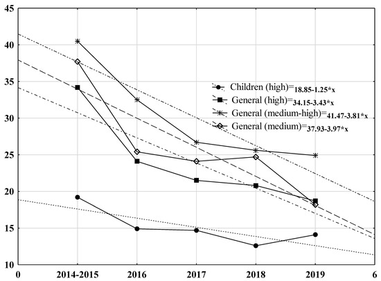 Trend of CT rate reduction during surveillance period in children’s (p < 0.03) and general hospitals (p < 0.001). Legend: Time series model presents the equation for each type of hospitals. Trendline (linear) presented as dash.