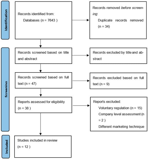 An ecological study evaluating the impact of junk food broadcast marketing policies on nationwide junk food sales reported that, between 2002 and 2016, countries with mandatory regulations experienced a drop in sales per capita (−8.9%), whereas those with only self-regulatory measures experienced an increase (+1.7%, p = 0.004) [25]. Thus, there is general agreement among public health professionals that mandatory regulatory measures are needed to advance obesity prevention policies [27]. Evidence of their effectiveness is necessary to strengthen the argument in favor of these policies. In response, the current review provides a comprehensive exploration of the available evidence on the impact of mandatory food-marketing regulations, including advertisements and packages, on the exposure and purchase of HFSS food products, to help justify the need for these regulations. Section 2 contains a description of the methodology and data collection process used in this study. Section 3 lists the effects of food-marketing regulations on four countries (Chile, UK, Ireland, and Spain) employing such regulations. A discussion of the study’s findings is presented in Section 4, and Section 5 specifies the limitations and suggests future directions and implication of the study. Finally, Section 6 presents the study’s conclusions. This review differs from previous work carried out in the same area by focusing only on mandatory regulations with exposure and purchasing activities as outcomes.