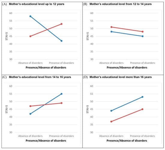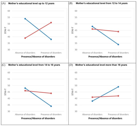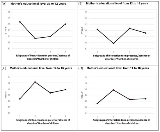 It can be noticed that the influence of individual independent factors of interaction terms on STAI-S and STAI-T is different. It can be seen that the pattern of interaction is different in all four mothers’ education level groups. For the STAI-S, there is an interaction between the number of children in the family and the presence/absence of disorders in the mothers’ education level groups up to 12 years and from 14 to 16 years, while there is no interaction between these two factors for the other two mothers’ education groups (from 12 to 14 years and more than 16 years). The situation is different for STAI-T, as there exists an interaction between the number of children in the family and the presence/absence of disorders independently from the mothers’ education level. One-way ANOVA revealed a statistically significant difference between the subgroups of the grouping variable number of children in the family * presence/absence of disorders in the different groups based on mothers’ education level. For example, in the mothers’ education level group of up to 12 years, we found a statistically significant difference for STAI-T between mothers with one child without disorders (STAI-TMean = 52) and one child with a disorder (STAI-TMean = 38.33); one child without disorders and two or more children without disorders (STSAI-TMean = 39); two or more children where one has a disorder (STAI-TMean = 50.11) and one child with a disorder; and two or more children with a child having a disorder and two or more children without disorders. In the mothers’ education level group from 12 to 14 years, we found a statistically significant difference for STAI-T between mothers of two or more children without disorders (STAI-TMean = 46.76) and one child with a disorder (STAI-TMean = 34.29); and two or more children without disorders and two or more children where one has a disorder (STAI-TMean = 42.87). For the mothers’ education level group from 12 to 14 years, we found a statistically significant difference for STAI-S and STAI-T between the observed subgroups. The distribution of the STAI-T mean values for the statistically significant subgroups in different groups of mothers’ education level is different. While mothers of one child without disorders have the highest level of STAI-T in the group with up to 12 years of education, at the same time, the equivalent subgroup of mothers have the lowest level of STAI-T in the group from 14 to 16 years of education. In the studies conducted during 2021, different results have been obtained from research on the influence of the number of children in a family on parenting stress [40,93]. In one study [40], parents with one child have a higher stress level, while in the other study [93], parents of two children have a higher stress level. A possible reason for these contradictory results is different cultural backgrounds and life expectations. It implies that adverse conditions can bring different outcomes, so the level of education can lead to the results we obtain.