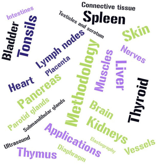 We searched for studies reporting on UE in children in PubMed, Web of Science and Google Scholar databases. The PubMed search in June 2023 using “ultrasound elastography in children” yielded 1207 results on several topics in pediatrics, presented in Figure 1. The results were next filtered according to their significance, methodology and examined organ, presenting several indications for use of UE, as presented in this review.