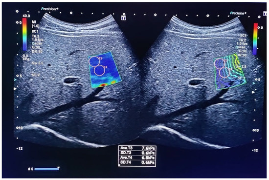 The measurement starts with a good visualization of the target organ with classical imaging. Next, the appropriate software is switched on at the desired location within the organ and points at it with the indicator, as presented in Figure 2. Several elasticity areas within the organ are measured and the mean or median value of measurement is provided using speed (m/s) and pressure (kPa) modules, both describing tissue’s elastic properties. The quality of the measurement is ensured by the manufacturer’s instructions.