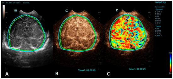 Brain CEUS is a promising diagnostic tool that may have advantages in comparison to MRI. Due to its bedside nature, it can be performed at any time, even during therapeutic hypothermia in an intensive care unit. Therefore, it may be used to diagnose HIE earlier and also allow monitoring the patient’s response to the treatment. The ability of CEUSs to visualize the microvasculature and evaluate brain perfusion in real time means that it has great potential to become a valuable diagnostic tool in the evaluation of HIE. There are many studies reporting the use of CEUSs for the assessment of HIE [9,24,37,38]. Recently, a quantitative CEUS approach has been introduced to screen for the presence of HIE [24]. In this study, infants with HIE were distinguished from unaffected infants by assessing the ratio of basal ganglia to cortical perfusion using wash-in, peak enhancement, and area-under-the-curve kinetic parameters on a time–intensity curve. Another recent study demonstrated that alterations in the CEUS wash-out perfusion parameters can be observed in the presence of a hypoxic-ischemic injury [38]. Future research with larger cohorts is needed to validate the diagnostic utility and prognostic value of CEUS in HIE cases. In addition, the establishment of a large CEUS database with normal brain perfusion parameters are also necessary (Figure 1).