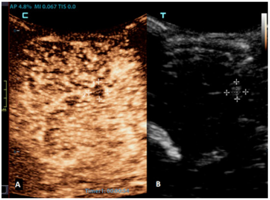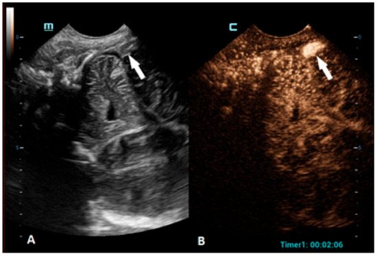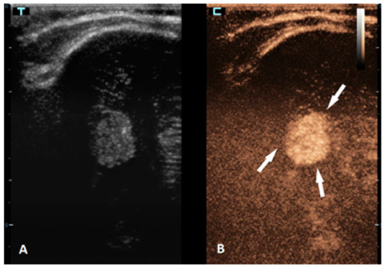 - Sidhu, P.S.; Cantisani, V.; Dietrich, C.F.; Gilja, O.H.; Saftoiu, A.; Bartels, E.; Bertolotto, M.; Calliada, F.; Clevert, D.A.; Cosgrove, D.; et al. The EFSUMB Guidelines and Recommendations for the Clinical Practice of Contrast-Enhanced Ultrasound (CEUS) in Non-Hepatic Applications: Update 2017 (Long Version). Ultraschall Med. 2018, 39, e2–e44. [Google Scholar] [CrossRef] [PubMed]