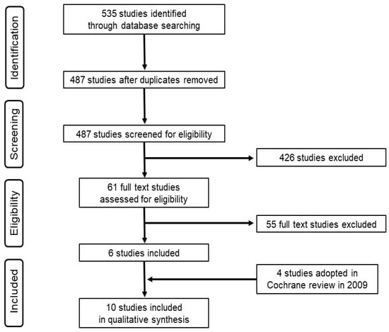 Database searches identified 535 reports. Of these, 48 reports were removed by duplicate, 426 reports were excluded by title and abstract screening, and 55 reports were excluded by full-text screening. Six reports (Doyle 2014 [], Chollat 2014 [], Paradidis 2012 [], Drassinower 2015 [], Colon 2016 [], and Wolf 2020 []) met the inclusion criteria. In order to use the literature before 2008, we also added five reports (Crowther 2003 [], Marret 2006 [], Mittrendorf 2002 [], Rouse 2008 [], and Magpie 2006 []) adopted for analysis in Cochrane review published in 2009 []. We excluded Magpie 2006 because data from pregnant women less than 37 weeks gestation were not available even though we tried to contact the authors to obtain them. Finally, 10 reports were included in this analysis (Figure 1).