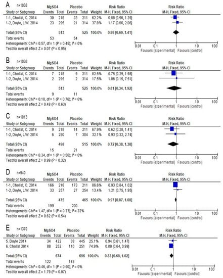 Two studies (Doyle 2014 and Chollat 2014) reported on this outcome. The MgSO4 group was not significantly different from the placebo group (RR, 0.83; 95% CI 0.68–1.02, I2 = 0%; low certainty of evidence) (Figure 3E).