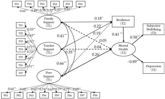 3.4. Test of Predictive Effect of Peer, Family, and Teacher Support on Mental Health of Unaccompanied Children: The Mediating Role of Resilience
