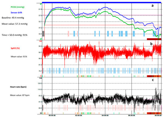 Overnight transcutaneous CO2 (TcCO2) trend of a 7-year-old female affected by Rett Syndrome. (a) The green trace is the measured TcCO2 while the blue trace is the drift corrected TcCO2; they follow the same pattern over the time. The monitoring shows a hypoventilation pattern (mean TcCO2 57.2 mmHg, time spent with TcCO2 > 50 mmHg 91%). The peaks in TcCO2 correlated with (b) oxygen desaturation events and (c) the increase of the heart rate. An improvement in the pattern is observed between 06:00 and 08:00 a.m., as the patient wakes up.