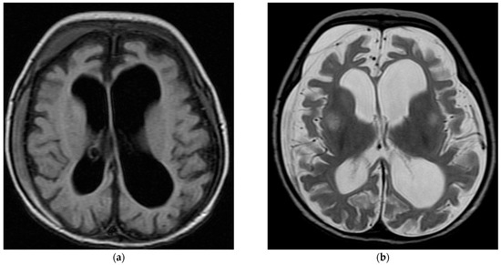 Three-quarters (75.6%) of the patients with mutations had one or more neurological features. These included developmental delay (44.4%), microcephaly (20.0%), hypotonia (15.6%), dysmorphic features (15.6%), vision problems (11.1%), and movement disorders (11.1%). Almost two-thirds had a cognitive delay (24.4%), language delay (22.2%), or both cognitive/language delay (17.8%). Approximately 29% of the patients had one or more abnormal behavioral features. These included attention deficit hyperactivity disorder (ADHD, 8.9%) and autism spectrum disorder (ASD, 4.4%). Compared with those with negative WES, those with mutations had more developmental delay, dysmorphic features, and abnormal behavioral features but less ataxia and choreoathetosis. Except for ataxia (p = 0.020), none of these differences reached statistical significance (Table 2 shows the patients’ Neurological, cognitive, and behavioral features). The patient with FARS2 gene mutation had intractable focal onset seizure since birth, hypotonia, and developmental delay. His MRI is shown in Figure 1. On the other hand, the ADAT3 patient had his first seizure at six years of age in form of generalized tonic–clonic seizure, which evolved later into staring and behavior arrest. His seizure was later on controlled with no medication. He had global developmental delay before seizure onset. His brain MRI was unremarkable.