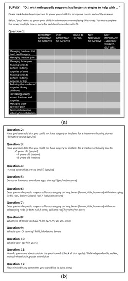 We created a 12-question survey (Figure 1a,b) piloted by the authors and approved by the OIF. The survey was titled, “O.I. wish orthopedic surgeons had better strategies to help with…” and sought to gather information regarding the aspects of orthopedic care OI patients and families feel to be the most pressing to address. The survey was electronically distributed via Survey Monkey to all members of the OI Registry, which includes 2099 US and international enrollees. After distribution, a total of 341 individuals completed the survey. The OI Registry is housed and managed by the Health Informatics Institute at the University of South Florida, which also provided IRB approval for the survey. The first 11 questions were each analyzed into frequency of categorical answers and then graphed for ease of interpretation. As this study aims to present qualitative data from a survey study, statistical methods are limited to basic frequencies, percentages, and averages of appropriate responses. As there were no comparison groups, no additional statistical analyses were needed for this qualitative, survey-based research. All data reported in this manuscript is participant-reported, including OI type and OI severity—with the explicit aim of achieving a better understanding of patient-perceived OI severity. The final question of the survey indicated, “Please include any comments you would like to pass along”. To report on the responses for this question, the answers were grouped into eight different themes of answers. We report on the frequency of responses within each theme.