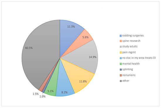 The survey’s final question was an open-ended question requesting candid and honest comments from patients and families regarding the topic of the survey. There were 195 individual responses in this section that were grouped into eight themes (Figure 3). The most frequent comments were to focus future research on OI adults (14.9%), focus on pain management (11.8%), and focus on improving rodding surgery techniques (11.3%). Approximately 40% of the responses were more challenging to categorize into themes, and they were put in the “other” category, but there were several comments requesting additional focus on joint replacement in OI adults, joint stiffness in OI adults, and the use of ambulatory aids in OI patients.