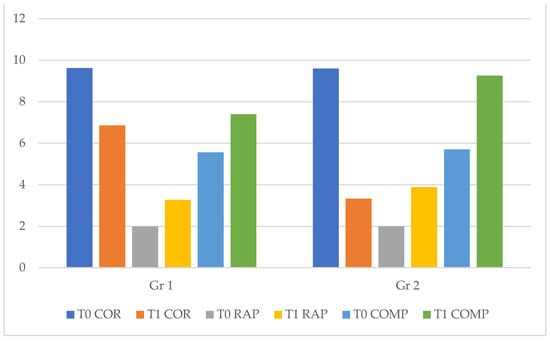 The analysis reveals a significant interaction between the three subscales (scale*time*group) [F (1, 58) = 97.907, p < 0.001]. This indicates that there are notable interactions among the subscales, time, and type of treatment. Specifically, at T1, both interventions led to significant improvements in the three subscales of the MT tests. However, in Group 2 (G2), there was a more significant improvement in the correctness parameter compared to Group 1 (G1) (Table 2 and Figure 1).