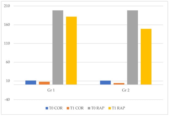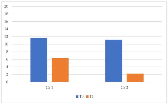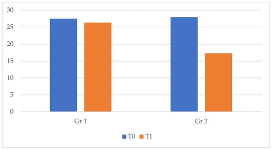 The analysis reveals a significant interaction between time and group (time*group) [F (1, 58) = 53.578, p < 0.001]. This indicates that there are notable interactions between the two variables, time, and the type of intervention. Specifically, both treatments resulted in an improvement in the BVSCO scale. However, this improvement is more significant in Group 2 compared to Group 1 (Table 4 and Figure 3).