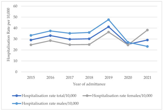 Over the study period, a total of 1032 hospital admissions related to alcohol occurred in 1016 patients aged 10–17 years old. This number of patients represents a mean annual hospitalisation rate of 31 per 10,000 10–17-year-old inhabitants in the city of Antwerp over the study period, with a significant increase in the annual hospitalisation rate occurring in 2019 (p < 0.001), though it stabilised in 2020, as shown in Figure 1.