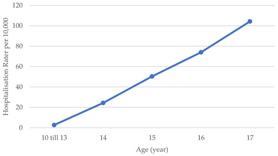 Furthermore, 33.4% of the patients were below the legal alcohol consumption age of 16 years old at the time of admission. Figure 2 shows the mean hospitalisation rate per 10,000 inhabitants per age group. The higher the age group, the higher the mean hospitalisation rate, with significant differences shown per age group (p < 0.001).