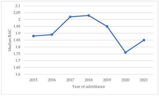 An important clinical characteristic of AAI is blood alcohol concentration. As shown in Table 2, median BAC was 1.95 g/L, having a significantly higher BAC in males than in females (p = 0.04). When analysing trends in BAC over the study period, a significant decrease in median BAC was observed in 2020 compared to other years (p = 0.03), as shown in Figure 3.