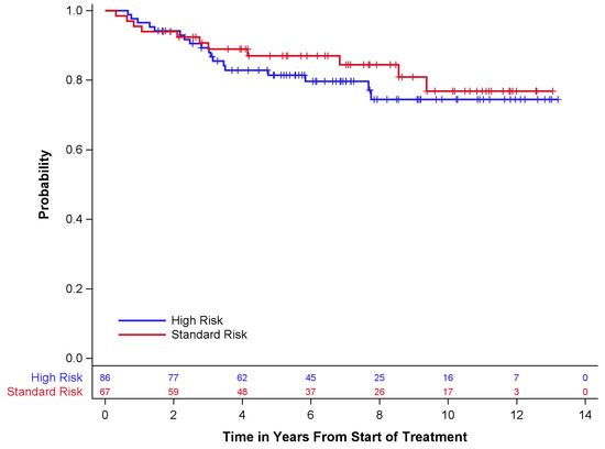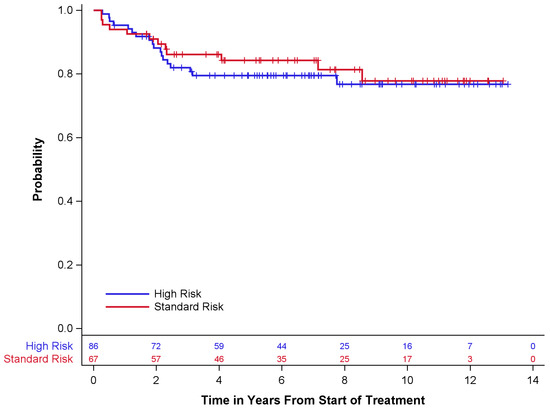 Survival outcomes are described in Table 4 and Figure 1 and Figure 2 below. Of the 67 standard-risk patients, 56 (84%) remained alive at the time of last follow-up; 68 (79%) of 86 high-risk patients were alive at the time of last follow-up. Overall survival (OS) and event-free survival (EFS) for standard-risk patients at 5 years ± standard error (SE) were 87 ± 4.3% and 84 ± 4.6%, respectively, while the 5-year OS and EFS for high-risk patients were 81 ± 4.3% and 79 ± 4.5%, respectively. Only one patient had disease progression prior to radiotherapy. Twelve (18%) standard-risk patients had disease recurrence, eleven of whom died after recurrence. Eighteen (21%) high-risk patients had disease recurrence, all of whom died after recurrence.
