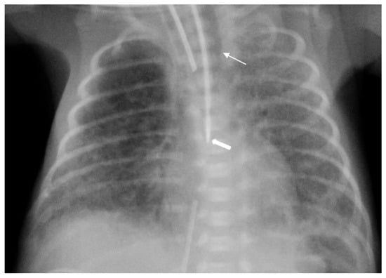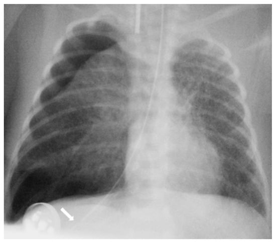 Radiographs of the chest are useful in demonstrating the presence of the og/ng tube in situ and might reveal three different malpositions of the nasogastric tubes, typically in the right pleural cavity associated with right-sided pneumothorax or pneumomediastinum and sometimes pleural effusion. Common symptoms in this situation are connected with the deterioration of the respiratory status. A chest radiographic image may reveal excessive amounts of air in the mediastinum. The high position of the og/ng tube mimicking an esophageal atresia effect may be due to the presence of a mass created by a false passage of air or milk in the mediastinum [9,14]. The position of the top of the og/ng tube may be helpful in differential exclusion. In true esophageal atresia, it is usually above the bifurcation of the tracheae, while in the mimic esophageal atresia, it is located below the bifurcation. In doubtful cases, esophagoscopy can be conclusive [15]. The presence of gas along the og/ng tube may also be helpful in diagnosing EP. The third possible malposition of the og/ng tube involves the intra-abdominal location, which might be associated with the absence of gas in the intestines. It must be noted that a radiographic image cross-table lateral might, in this case, indicate where the tip of the og/ng tube would appear in the posterior/retroperitoneal space. This would be advisable for a more precise diagnosis. Another complication described by Sorens was mediastinal abscess requiring chest drain insertion [16]. Occasionally, patients with intra-abdominal EP might present symptoms of peritonitis or dysphagia and drooling [1]. In our study, like Elgendys’ study, pneumothorax and septicemia were frequent complications of esophageal perforation [17]. We diagnosed peritonitis in one patient and necrotizing enterocolitis in one patient. In one patient, cardiorespiratory decompression was connected to pleural milky effusion. Chylothorax should be considered and excluded upon differential diagnosis when milk is present in the pleural cavity and milky fluid can be aspirated from the right pleural cavity. Kairamkonda linked chylothorax with esophageal perforation, which may follow when the value of the laboratory fluid analyzed shows a triglyceride level of >1.1 mmol/l with absolute cell count > 1000 cells/mcl and lymphocyte fraction > 80% [18,19,20].