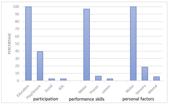 On average, the participants received 11.50 (SD = 1.03) intervention sessions. All sessions were performed individually at the clinic. Almost 90% of the parents were present in the treatment room during the interventions. All participant data on the intervention’s goals were collected and clustered into categories according to the domain of occupation (e.g., ADL, Education, or Play) or the performance skills and client factors (e.g., motor) the intervention aimed to promote. The summary of the findings as presented in Figure 1 indicates that the treatment goal of promoting participation in education was set for 100% of the participants, and the goal of promoting participation in play/leisure was set for approximately 39% of the participants. In addition, the treatment goals for most of the children (over 95%) were aimed at promoting motor performance skills and clients’ motor ability factors. Using the D.O.T.S.I., the therapists documented each intervention session. We summarized all session reports and calculated the percentage frequency of each item in the total intervention (Table 2). The most frequent intervention type was purposeful activity. Most treatments included activities that involved neuromuscular skeletal functions and motor skills. The most frequent sub-category of occupation was leisure/play. The establish/restore strategy was the most-used intervention.