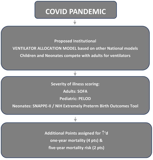 Adults are assigned scores based on their Sequential Organ Failure Assessment (SOFA) score [5] and associated co-morbid conditions; children are assigned scores using the Pediatric Logistic Organ Dysfunction-2 score (PELOD-2) and associated co-morbid conditions [6]. Neonates are assigned scores based on either the National Institute of Health (NIH) Extremely Preterm Birth Outcomes Tool [7] or the Score for Neonatal Acute Physiology with Perinatal Extension (SNAPPE-II) [8], along with associated co-morbid conditions. Both of the neonatal scoring tools are not validated for use in a triage setting. They were designed to assess outcomes in the setting of periviability and applied in the first 24 h after birth. In our institution’s proposed allocation model, additional points are given to co-morbid conditions that increase one- and five-year mortality. Two points are added for increased five-year mortality and four points are given for increased one-year mortality. To avoid discriminating against individuals based on age, disability, or pre-existing disease, the model was designed so that the only outcome of importance for the scoring tools and additional points was mortality.