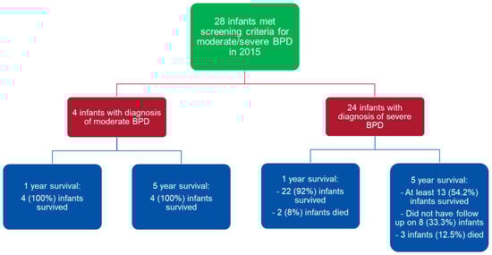 In 2015, twenty-eight infants were diagnosed with moderate-to-severe BPD at Rainbow Babies and Children’s Hospital (RBC) Neonatal Intensive Care Unit (NICU). Of those twenty-eight infants, four infants had moderate BPD and twenty-four infants had severe BPD (Figure 2). An assessment of one-year and five-year mortality in babies with moderate BPD showed that all infants (100%) with moderate BPD were alive at one year and at five years of age (Table 1). An assessment of one-year mortality in infants with severe BPD showed that, by one year, two had died (8%) and twenty two survived (92%). We also included an assessment of five-year outcome for babies with severe BPD, even though the triage protocol only utilized one-year mortality rates for these babies. For these twenty-four babies with severe BPD, by five years, three infants had died (12.5%) and at least thirteen survived (54%). We did not have five-year outcome for eight infants with severe BPD (33%). Thus, the lowest possible survival was 54% for babies with severe BPD at five years, if we assume that the babies without follow-up data did not survive.