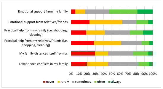 While over 54% of caregivers reported feeling supported by their family members, distant relatives and friends were indicated much less often (20%) (Figure 1). At the same time, many caregivers reported receiving little practical help in daily activities, such as shopping or cleaning either from their family (28%) or relatives and friends (13.4%).