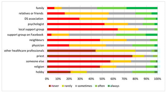 All in all, this study supports previous findings which show that although most DS carers are primarily challenged by the physical, mental and behavioural state of their DS children, they also lack coping resources, and do not feel supported by their families, government and social institutions and healthcare professionals. Consequently, most caregivers are under constant stress and experience helplessness, depression, anxiety, fear, physical fatigue, mental exhaustion and financial burden []. Thus, while parents of children with other neurological disorders, i.e., autism, fragile X syndrome, Prader–Willi syndrome, Williams syndrome or 22q11.2 deletion syndrome also feel burdened by their child’s conditions, mood swings and behaviours, and experience high levels of emotional distress, anxiety and depression [,,,,,,,,], they also report higher life satisfaction and better interactions with their families, while in DS such negative emotions are at similar or higher level [,,,].