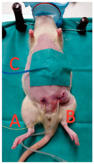 Prior to surgery, all animals were anesthetized via the inhalation of 5% isoflurane gas solution in a chamber. Sedation depth was evaluated via the assessment of the rat’s reflex to painful stimuli. If necessary, a second dose of the anesthetic was administered to ensure adequate anesthesia and sedation depth. Anesthesia was maintained using a 2.5% solution of isoflurane gas administered via a nose mask. The rat was then placed in a dorsal decubitus position, with all four limbs fixed to the surgical table using simple rubber bands. Preoperative depilation of the thorax and abdomen was performed (hair trimmer), followed by antisepsis using polyvinylpyrrolidone-iodine.