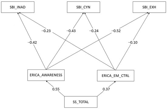 Descriptive statistics for the target variables can be consulted in Table 1. As presented in Table 2, negative significant correlations were identified between attachment security and exhaustion, r(599) = −0.50, p < 0.001, cynicism, r(599) = −0.51, p < 0.001, and inadequacy, r(599) = −0.47, p < 0.001 subscales of SBI, as well as between attachment and the overall burnout score, r(599) = −0.54, p < 0.001. Negative significant associations were also identified between the emotional control subscale of ERICA and exhaustion symptoms r(599) = −0.42, p < 0.001, cynicism symptoms, r(599) = −0.49, p < 0.001, and inadequacy symptoms, r(599) = −0.48, p < 0.001. The emotional awareness subscale was negatively associated with emotional exhaustion, r(599) = −0.57, p < 0.001, cynicism, r(599) = −0.56, p < 0.001, and inadequacy, r(599) = −0.55, p < 0.001. Positive significant correlations were identified between attachment security and emotional control, r(599) = 0.37, p < 0.001, as well as emotional awareness r(598) = 0.55, p < 0.001.