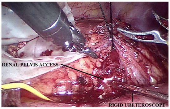 In all patients, a robot-assisted pyeloplasty was performed. In the two (29%) patients in whom nephrolithiasis was present, stone clearance was performed. In one case, the stones were simply removed by widening the renal pelvis incision and extracting them from the lower calyces (Figure 2). In the second case, once the renal pelvis was opened, a rigid ureteroscope (Ch 10) was inserted through the accessory laparoscopic port of 5 mm in the pelvis; nevertheless, the calyces that resulted were not easy to reach. Through the same trocar access, a flexible renoscopy was performed using a digital disposable flexible instrument. Without further increasing the pressure, irrigation of saline was used to permit viewing of the pelvis and calyces; the second robotic arm made it possible to maintain suction. A second stone was later identified, which was removed with a Dormia basket. Since the fact that the stones located in the medium and inferior calyx were larger than the circumference of the neck of the calyx, the extraction with the basket was not feasible. We performed lithotripsy with a Holmium laser through a 0.27 mm fiber. The mean operative time was 160 min (range 140–240 min). The average bladder catheter dwell time was 2 days (range 2–3 days), while the average abdominal drainage dwell time was 2 days (range 2–4 days). The mean hospitalization time was 4 days (range 3–9 days). On average, after 45 days (range 30–65) the JJ ureteral stent was removed cystoscopically.