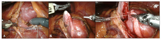 A case of a patient with a horseshoe kidney in which the renal pelvis is hidden (A). The great freedom of movement of the robotic instruments allows them to reach the pelvis (B) and perform pyeloplasty with ease (C).