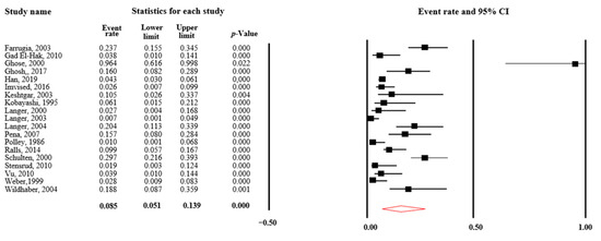 A total of 34 studies were included in the meta-analysis on the prevalence of TZA after the initial pull-through, representing 2207 patients. After the exclusion of the studies that only included patients who underwent redo pull-through, 19 studies were included in the meta-analysis on the prevalence of TZA, representing 1817 patients. The aggregated event rate of the occurrence of TZA was 9% (ER = 0.09, 95% CI = 0.05–0.14, p < 0.001, I2 = 86%). When including all studies on the prevalence of TZA, the aggregated event rate of the occurrence of TZA was 25% (ER = 0.25, 95% CI = 0.16–0.37, p < 0.001, I2 = 92%). A forest plot is shown in Figure 2. When including only the 15 studies representing 390 patients who underwent redo pull-through, the aggregated event rate of the occurrence of TZA in these studies was 59% (ER = 0.59, 95% CI = 0.46–0.70, p < 0.001, I2 = 73%). There was a significant difference in the aggregated event rate of TZA between studies composed of only patients who underwent redo pull-through compared to studies composed of patients after initial pull-through (Q = 49.9, p < 0.001). Stratification by operation technique (Duhamel/other techniques) led to the aggregation of 24 studies that allowed for this comparison. This analysis showed that 63 of 641 patients who underwent Duhamel had TZA (10%), whereas 199 of 1137 patients who underwent a different technique than Duhamel had TZA (18%), (X2 = 19.21, p < 0.001). The event rate of TZA was not associated with the year of publication of each study (b = 0.84, p = 0.176).