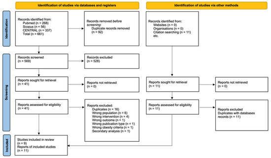Figure 1 shows the literature search and selection process in our study. Of the 661 total reports that were identified, 92 reports were detected through the Rayyan platform as duplicates, and 569 were excluded based on titles and abstracts. The remaining 41 reports were reviewed through the full text, and 30 were excluded based on eligibility criteria. The reasons for exclusion following a full-text assessment are listed in Supplementary Table S3. One of the included studies was multiply reported in three separate publications presenting distinct outcome data. A total of 11 reports (nine primary RCTs), involving 634 children who met obesity diagnostic criteria, were included in the final analysis.