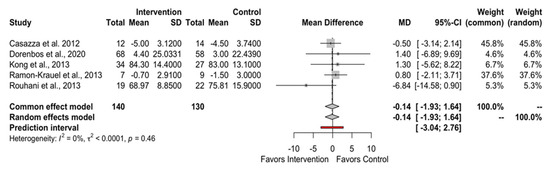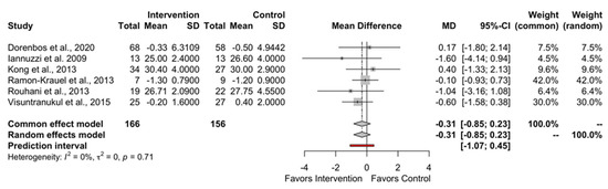 Figure 2 and Figure 3, and Supplementary Figures S1 and S2, depict the effect of low GI/GL dietary patterns on the primary outcomes of BW (MD: −0.14; 95% CI −1.93 to 1.64; PI −3.04 to 2.76), BMI (MD: −0.31; 95% CI −0.85 to 0.23; PI −1.07 to 0.45), BMI z-score (MD: −0.03; 95% CI −0.09 to 0.02; PI −0.12 to 0.06), and waist circumference (WC) (MD: −0.52; 95% CI −2.35 to 1.31; PI −3.49 to 2.45). There was no difference between the low GI/GL diets and control diets in any of our primary outcomes.