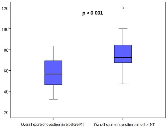 Our study did not demonstrate the efficacy of MT in improving cognitive impairment. This issue could be explained by the low prevalence of cognitive disorders in our study population (cognitive impairment scores before MT are shown in Table 2). Also, studies of the effects of MT on these pathologies have mainly been carried out on specific populations: adults or children suffering from severe neuropsychological disorders, such as autism [13].