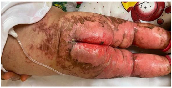 Due to a high level of procalcitonin the day after admission (91 pg/mL), associated with a skin swab positive for P. aeruginosa, C. albicans, S. aureus, and E. coli, even in the absence of impetiginisation, an intravenous antibiotic (piperacillin tazobactam, clindamycin) and antimycotic (fluconazole) therapy was started. Blood cultures always remained negative.