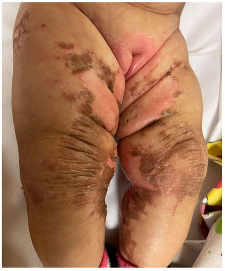 She was in poor general conditions, afebrile but dehydrated and suffering. The physical examination showed erythematous desquamative patches with large, combustiform, and scaly lesions involving the diaper area, trunk, perioral region, neck, and extremities. Ulcerations in the perianal area were also present, as shown in Figure 1, Figure 2 and Figure 3. Her body weight was 4.050 Kg (far below the 3rd WHO centile), the same as 1 month before.