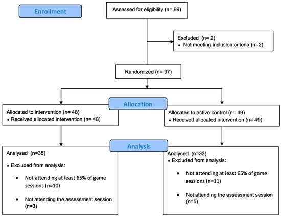 Figure 1 depicts the flow diagram of the study. Two children did not meet the inclusion criteria, leaving a total sample of n = 97. Participants were randomly allocated into an experimental group (n = 48) and an active control group (n = 49). The study was conducted during the COVID-19 pandemic so no social promotion entity granted that all the participants could follow all the sessions. We removed from the final analyses those participants who were absent in the evaluative sessions (pre or post), as it was not possible to evaluate them in any way, as well as those who has not attended at least 65% of the duration of the sessions of each of the games. We lost 29 participants for the reasons mentioned above. As shown in Figure 1, we lost an equivalent number of participants in both groups. Hence, the final sample consisted of children from 7 to 12 years (M = 9.98, Sd = 1.24, 50% female). They were attending between the third and sixth grade of primary education. We had enough participants to find significant effects based on the calculated sample size. However, we performed an attrition analysis to assess whether the retained sample showed differences from the excluded participants or not. We did not find significant differences in age (t (95) = −0.299, p = 0.766, d = 0.066) or in academic course (t (95) = −1.302, p = 0.196, d = 0.286). We even did not find differences in the distribution of sexes (χ2 (1) = 1.76, p = 0.185).