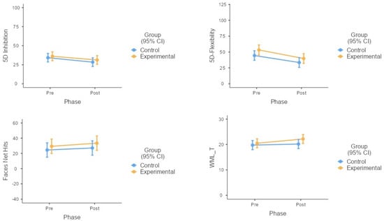 The main results of the present study can be seen in Table 2. We found significant intraindividual effects (pre- and post-changes) in the outcomes assessed with the 5-Digists test. Specifically, we found that all the sample reached lower scores after the intervention in flexibility (F = 24.829, p < 0.001) and also in inhibition (F = 8.915, p = 0.004). We found that both groups increased the net hits of the Faces test (F = 4.880, p = 0.037). Finally, we found a phase-by-group interaction in the visuospatial updating (F = 4.756, p = 0.033). After the intervention, we found higher hits in the visuospatial updating task in the control group than in the experimental group. See Figure 2 to find the specific effects.
