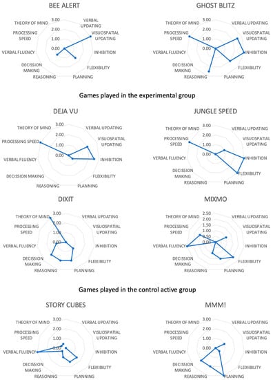 Finally, it is important to emphasize one crucial conclusion that was first shown in Vita-Barrull et al.’s study [7] and remarked in the present study. Selecting the games for a game-based intervention to activate specific cognitive processes is not easy or trivial. The best way of doing so is by analyzing the cognitive profiles of the games in the most objective way possible. However, we used Vita-Barrull et al.’s method as a post hoc analysis because the study by Vita-Barrull et al. [7] was published after we designed and began to collect the present study’s data. Ideally, we needed games that solely activated the experimental group’s specific basic executive functions and games that did not trigger any basic executive function. As shown in Figure 3, it seems that all the games used activated at least the basic executive functions (and the games in the control group activated the complex executive functions even better than the games used in the experimental group). Future studies must focus on this topic. Could it be possible that all the games that are not entirely based on luck activate at least the basic executive functions? A different selection of games could modify the results of the present study.